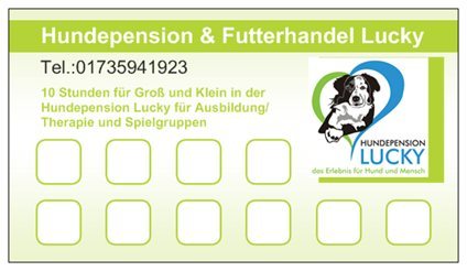 Ob als Geschenk für Hundebesitzer oder für den Eigenbedarf. Kaufen Sie eine Karte und erhalten Sie dafür 10 Tage in der Tierpension für die Tagesbetreuung oder 10 Stunden Ausbildung/Erziehung/Agility.